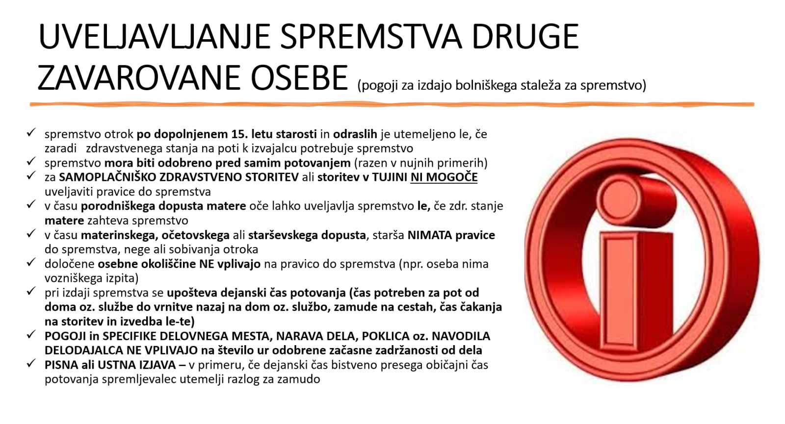 Na sliki so jasno predstavljeni primeri, kdaj je spremstvo upravičeno, kdaj ni mogoče ter na kaj je treba biti pozoren pri uveljavljanju pravice (npr. starost otroka, vrsta storitve, čas potovanja).